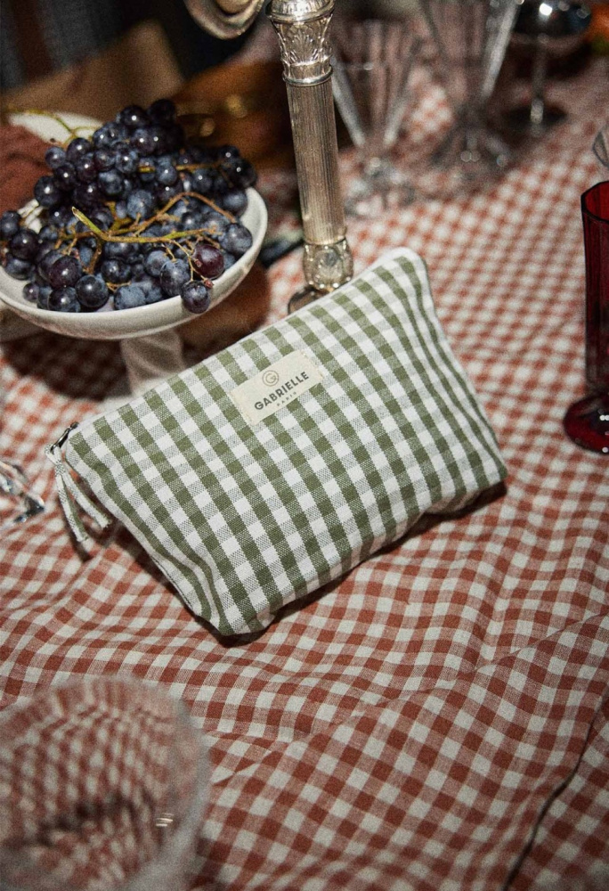 Sminkepung fra Gabrielle Paris av rutete bomull, 12 x 22 x 9 cm stor, foret og lukkes med glidelås og kan vaskes i maskin.