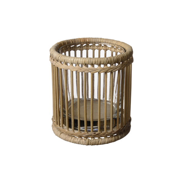 Liten lykt fra Bruka Design, laget av rotting med glassinsats. 10 x 10,5 cm.
