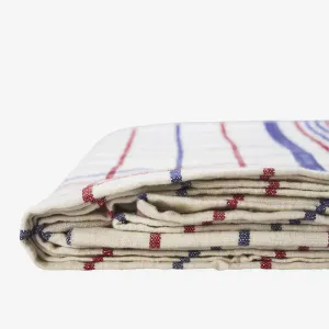 Hvit duk med ruter i rødt og blått fra Madam Stoltz. 150x150 cm, kan vaskes på 60 grader.