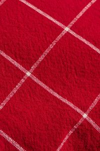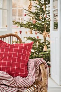 Putetrekk med rød bunn og tynne hvite striper, 50x50cm. 100% bomull.