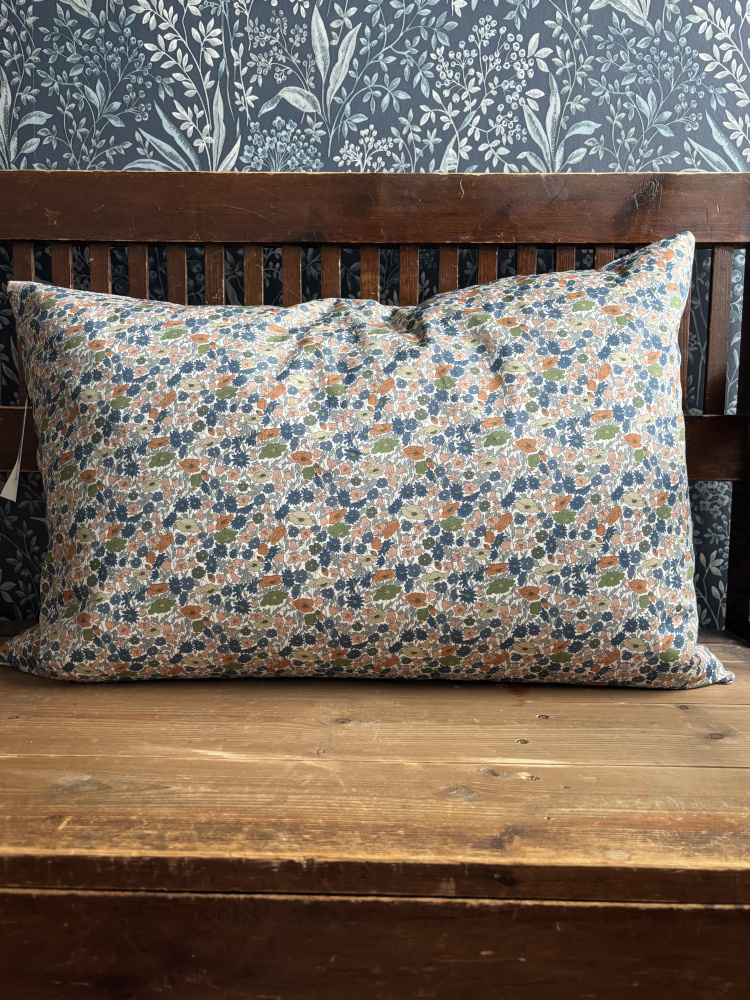 En dag kom Tove innom butikken vår for å handle. Hun hadde et veldig fint nett på armen, og Kristian spurte om hun hadde sydd det selv. Det hadde hun, og hun fortalte at hun sydde en god del, og at hun hadde sydd puter for en butikk i Oslo. "Kan du tenke deg å sy for oss da?" sa Kristian, og resultatet av denne praten ser du her. Putetrekk sydd av nydelige Libertystoffer, Tove har sydd dem med skjult glidelås og i størrelsen 40 x 60 cm. Dette har blomster i dempede toner med blått og litt fersken.