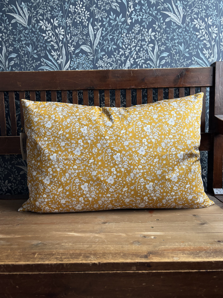 En dag kom Tove innom butikken vår for å handle. Hun hadde et veldig fint nett på armen, og Kristian spurte om hun hadde sydd det selv. Det hadde hun, og hun fortalte at hun sydde en god del, og at hun hadde sydd puter for en butikk i Oslo. "Kan du tenke deg å sy for oss da?" sa Kristian, og resultatet av denne praten ser du her. Putetrekk sydd av nydelige Libertystoffer, Tove har sydd dem med skjult glidelås og i størrelsen 40 x 60 cm. Dette har hvite blomster på en varm, gul bunn.