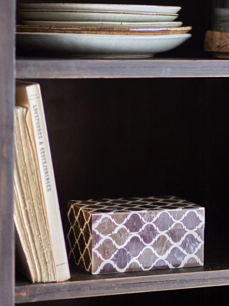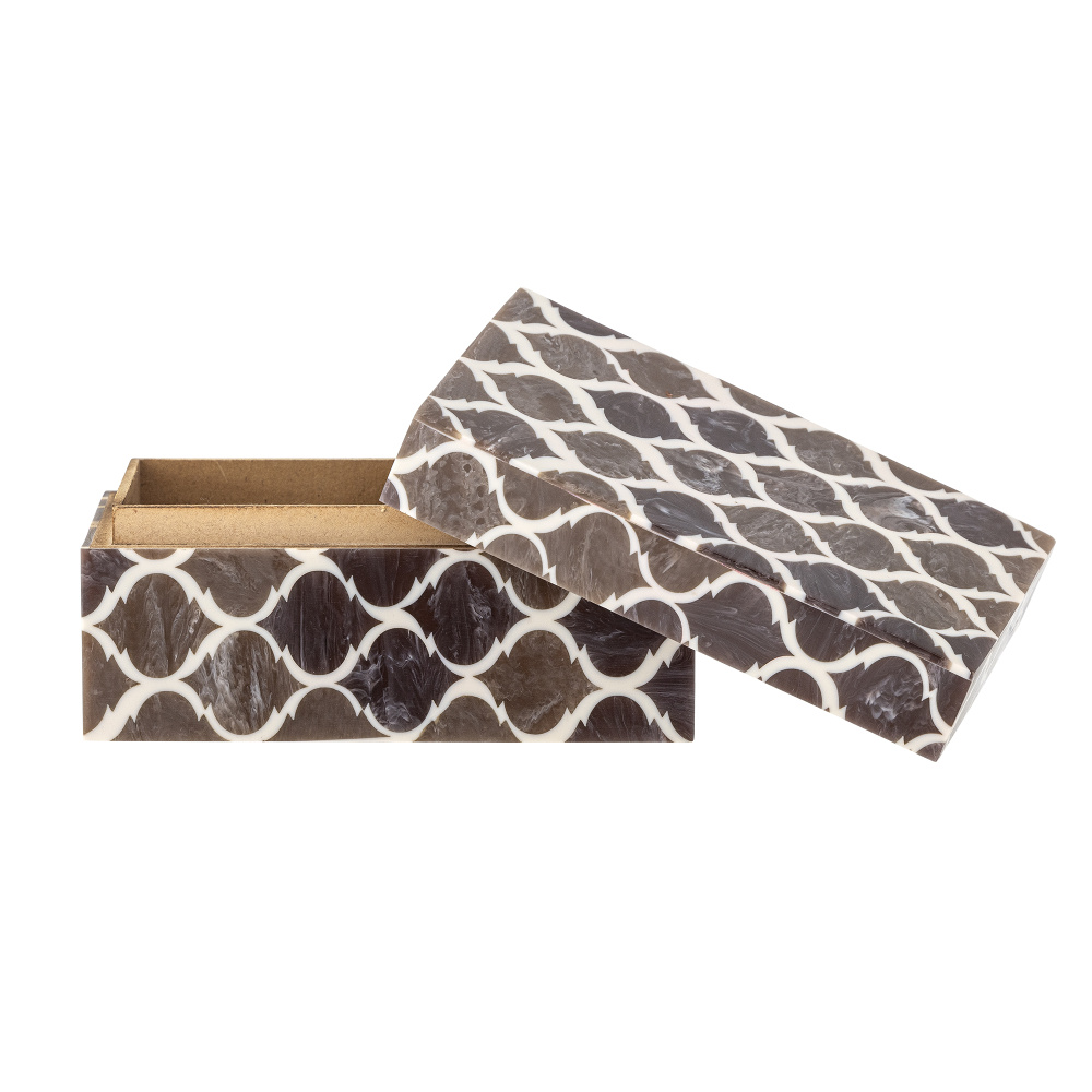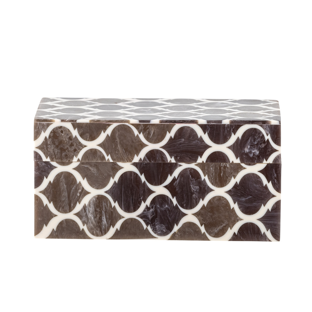 Boks/skrin med lokk fra Bloomingville og 15 x 10 x 7,5 cm, laget av mdf/resin.