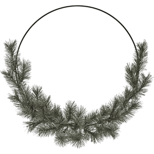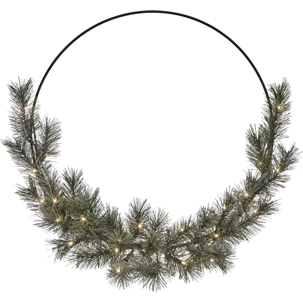 Krans laget av kunstig vintergrønt fra House Doctor, på metallring og med 25 LED-lys. Behøver 3 AA-batterier, disse følger ikke med. 45 cm i diameter.