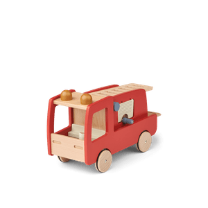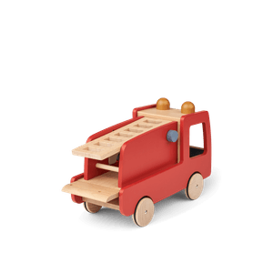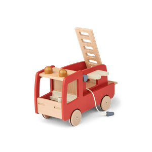 Brannbil i rødmalt bøketre/mdf, passer for barn fra 18 måneder. Måler 16 x17.3 x 26.6cm-