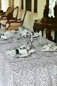 Håndtrykket, vakker duk i lin fra Chamois. Måler 150 x 230 cm. Vaskes skånsomt på 30 grader og strekkes etterpå.
