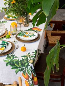 Linduk med trykket motiv, 170x250 cm stor. Seks forskjellige sitrus-motiv er trykket på vasket, myk lin. Vaskes på 40°C, kan tromles forsiktig. Strykes eller strekkes, alt etter som hvor rustikk du vil ha det.