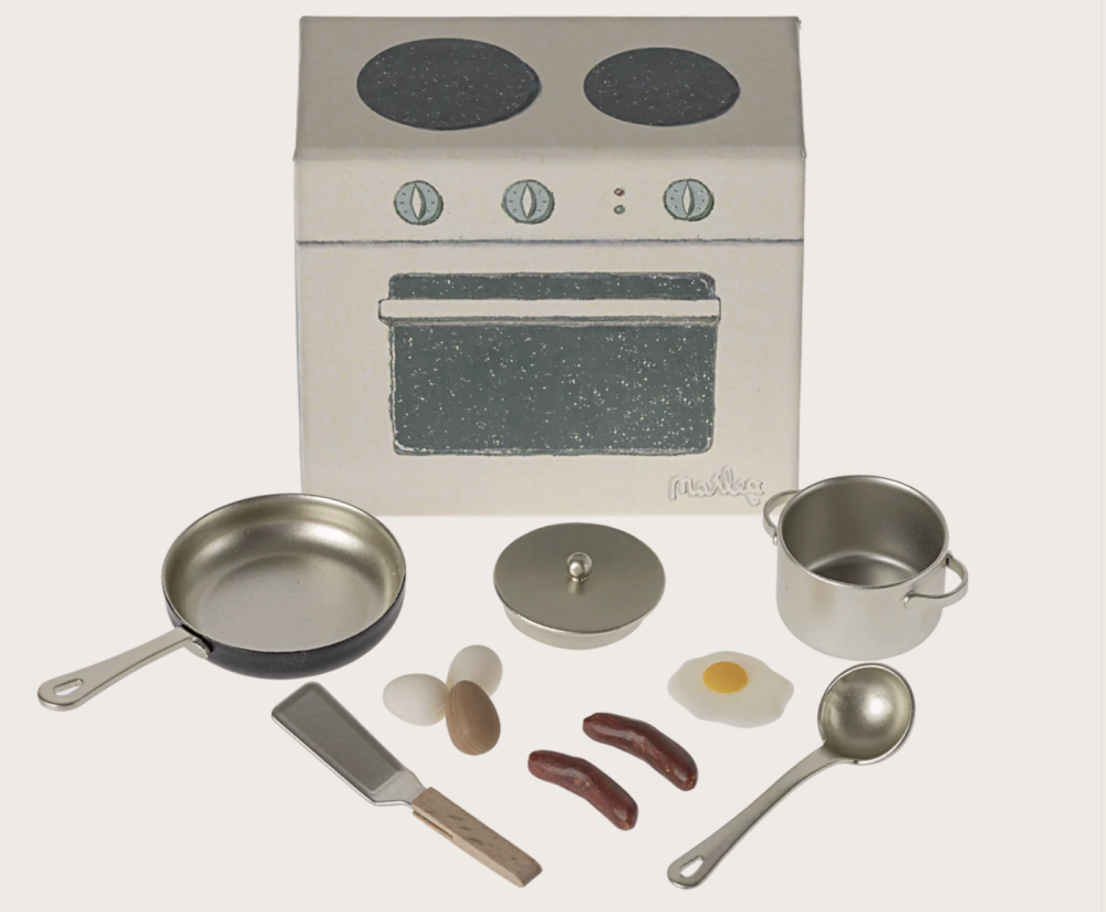 Komfyr av papp med masse kjøkkenutstyr som passer til mus, 8 x 9,5 x 5 cm.