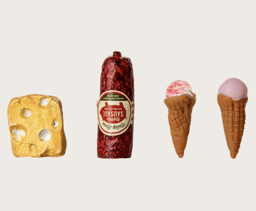 Kjøleskap som passer i musehuset laget av metall. Flere hyller inni og det følger med en ost, en pølsebit og to iskrem. 14 x 6 x 5,5 cm.