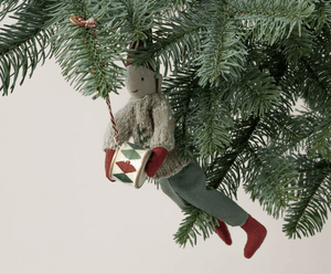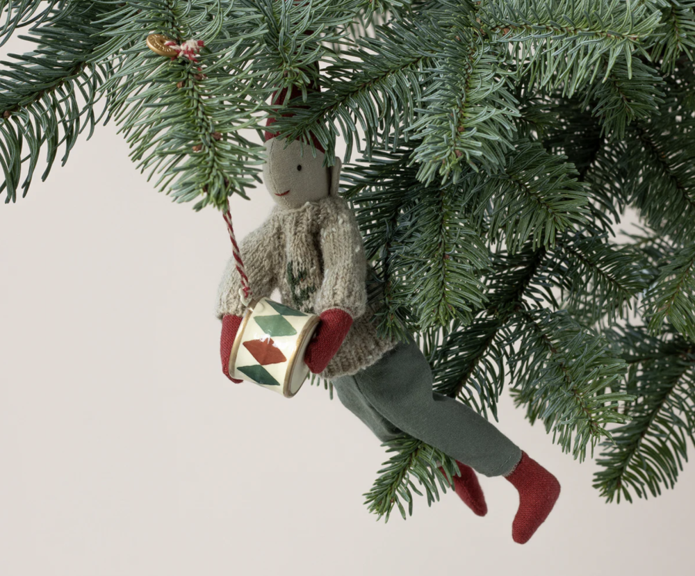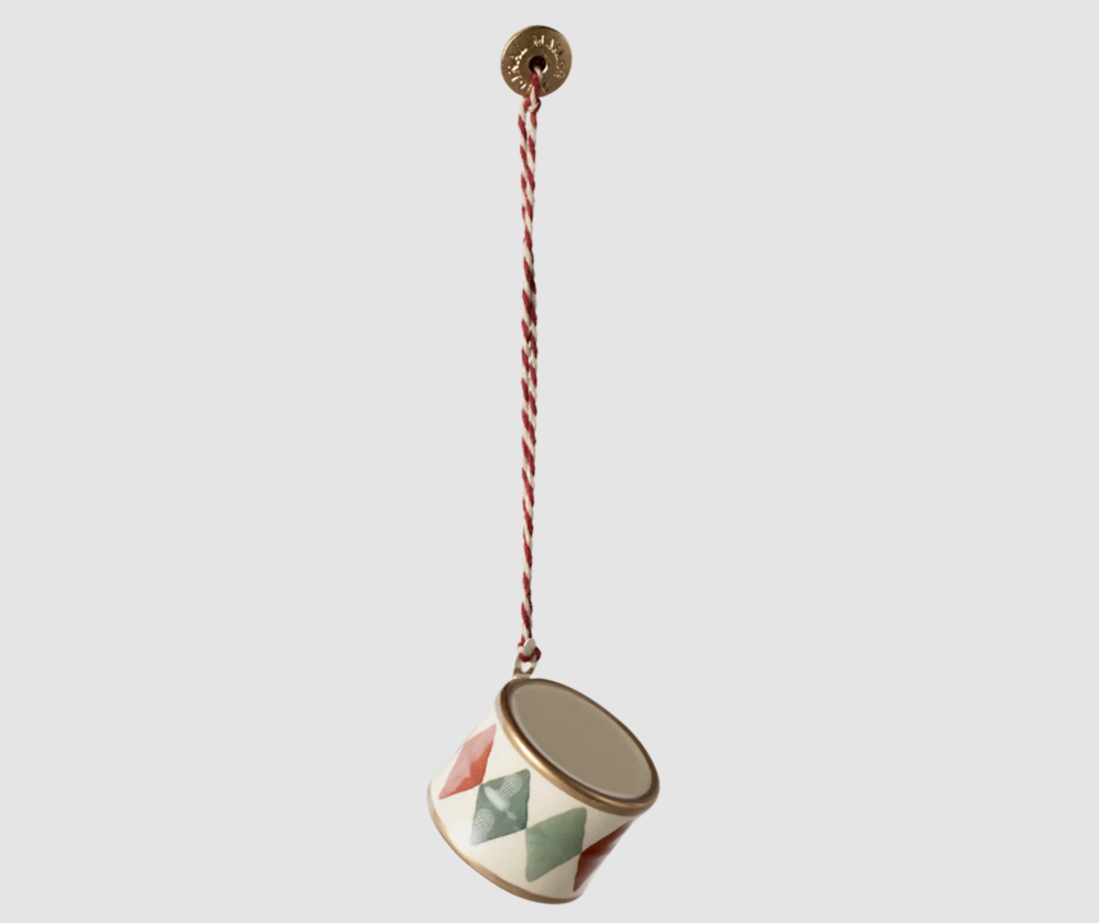 Liten tromme av metall med bånd for oppheng, 3x2,5 cm stor.