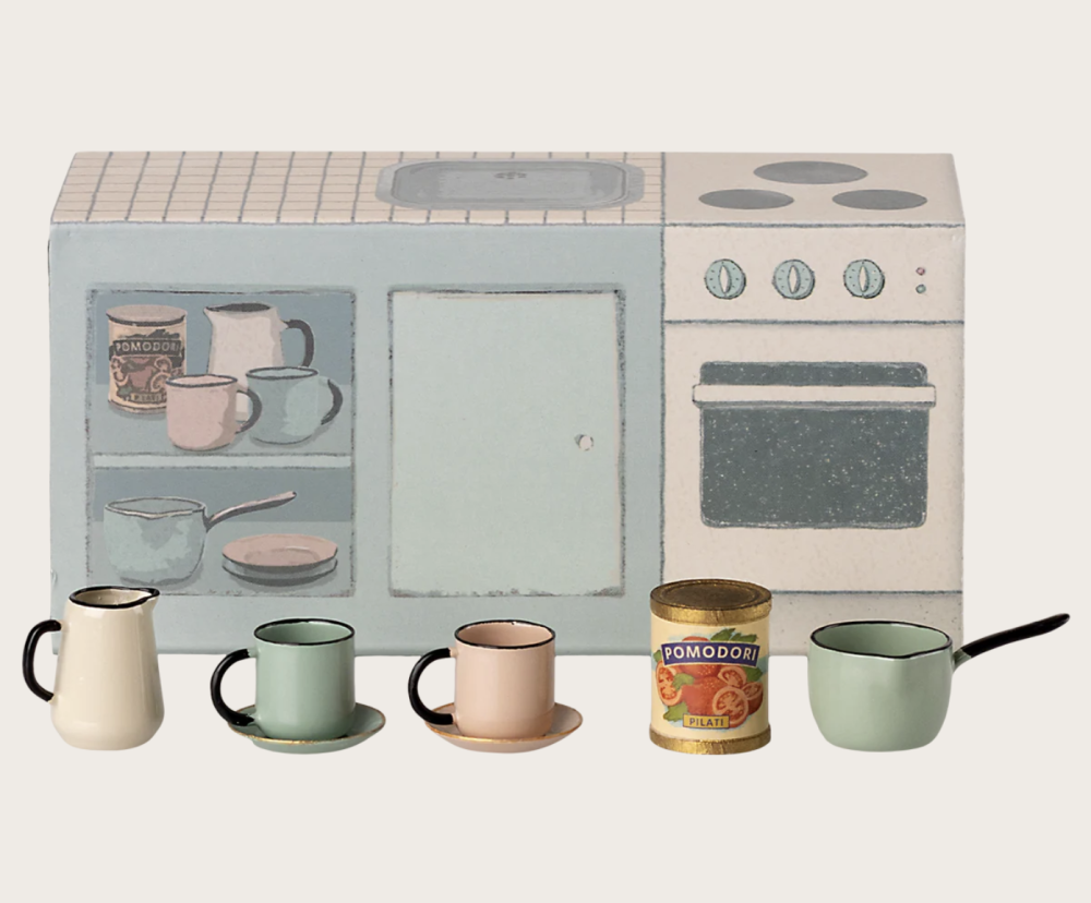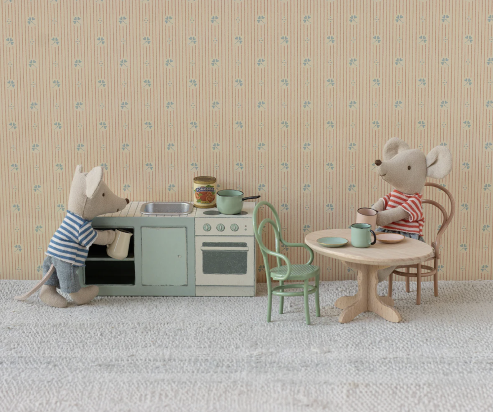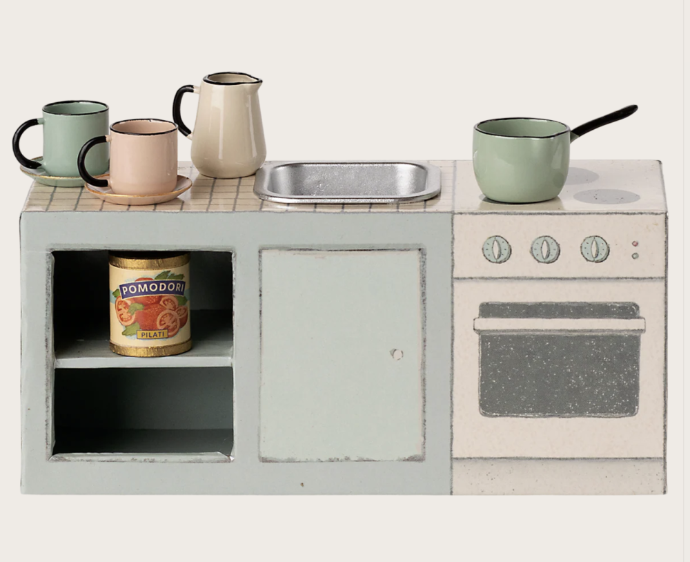Kjøkkenbenk med koppestell Mailegmus, laget av stiv kartong. 6 x 13 x 4,5 cm, størrelse Mouse.