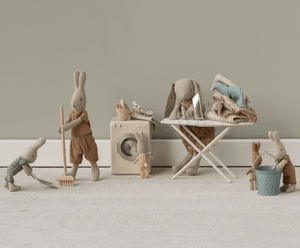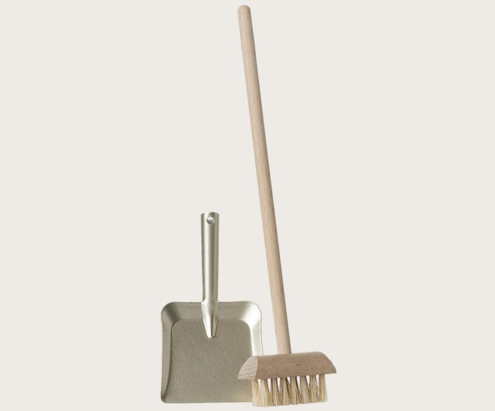 Når det skal feies i Maileghuset, kost og brett i sett, 17 cm. Kosten er av tre med naturbust, brettet av metall.