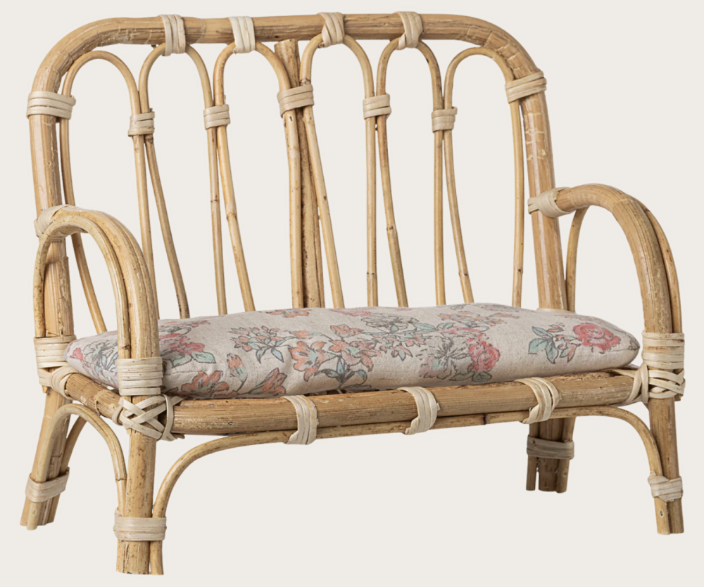 Søt benk fra Maileg, passer til litt større kaniner og harer, 27 x 30 x18 cm. Laget av rattan, kommer med sittepute av bomull.