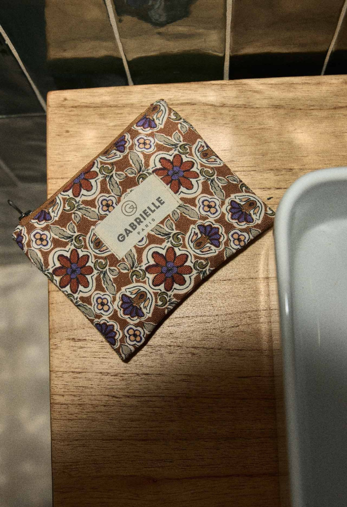 Pung fra Gabrielle Paris av mønstrete bomull, 13 x 10 cm stor, foret og lukkes med glidelås og kan vaskes i maskin.