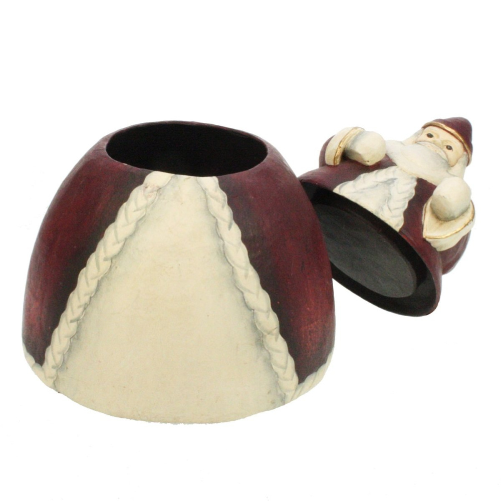 Håndmalt nisse med oppbevaring under kappa, ikke godkjent for mat, laget på Filippinene, 19,5 x 26 cm stor.