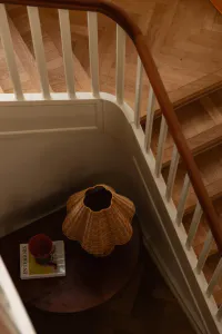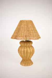 Bordlampe av rotting, med skjerm i samme materiale fra Olsson & Jensen, Ø:45, H:65 cm. Ledningen er 200 cm. E27-sokkel.
