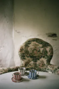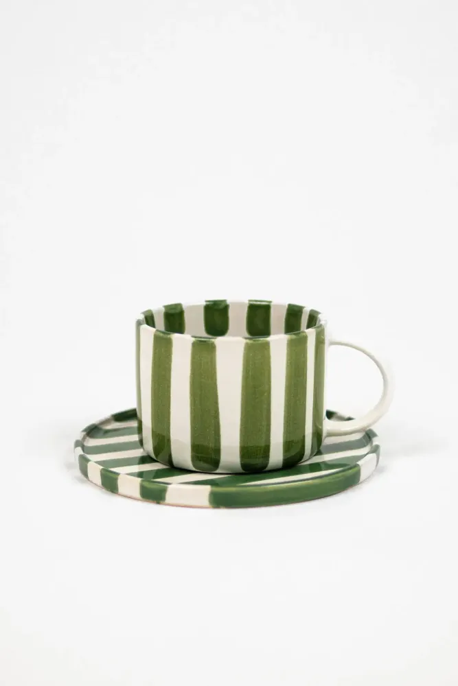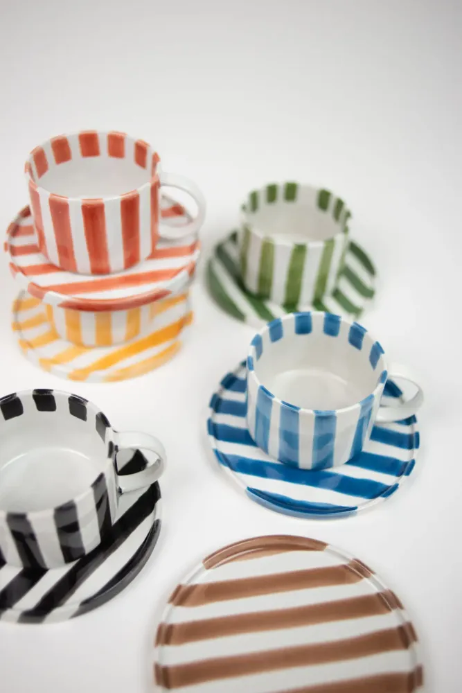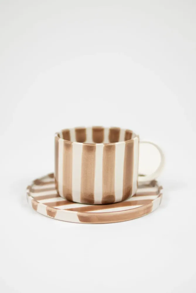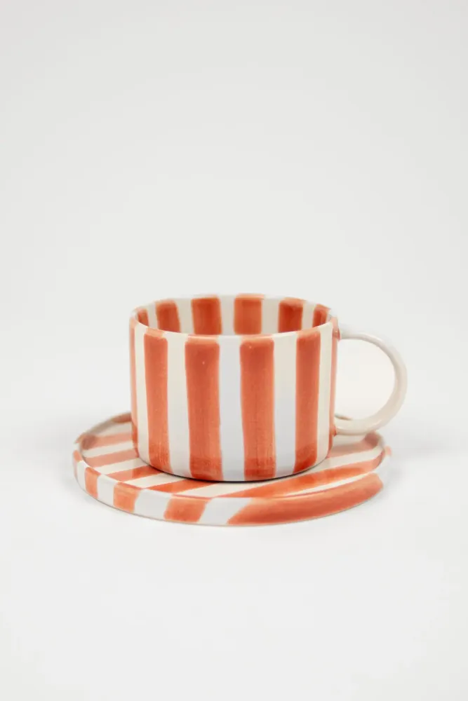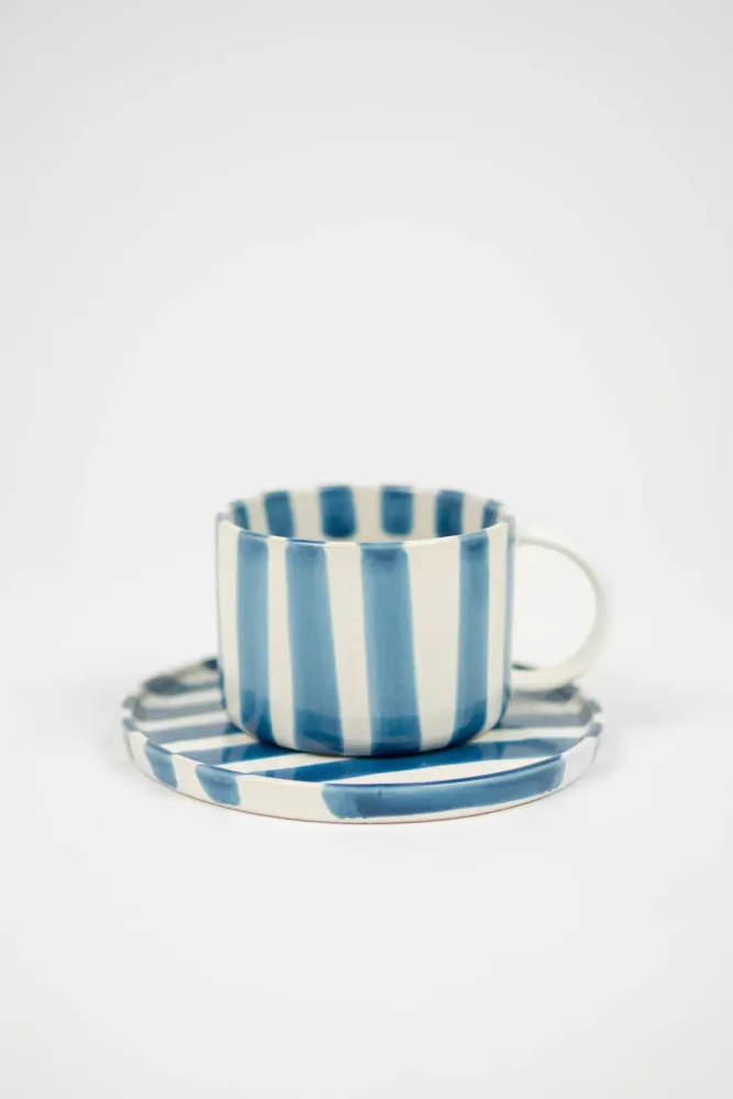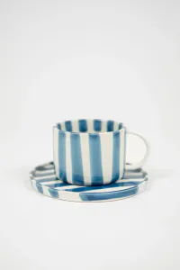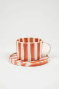 Stripete kopp med fat underl, kopp: Ø:8, H:6 cm Fat: Ø:13,5 cm. Kan vaskes i maskin.