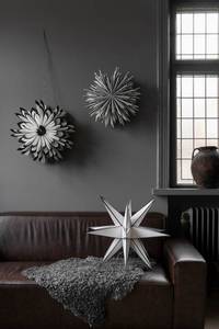 Papirstjerne i hvitt med svart dekor, 50 cm i diameter. Ledning og pære følger ikke med, men kan kjøpes separat. Husk å bruke en LED-pære som ikke blir varm.