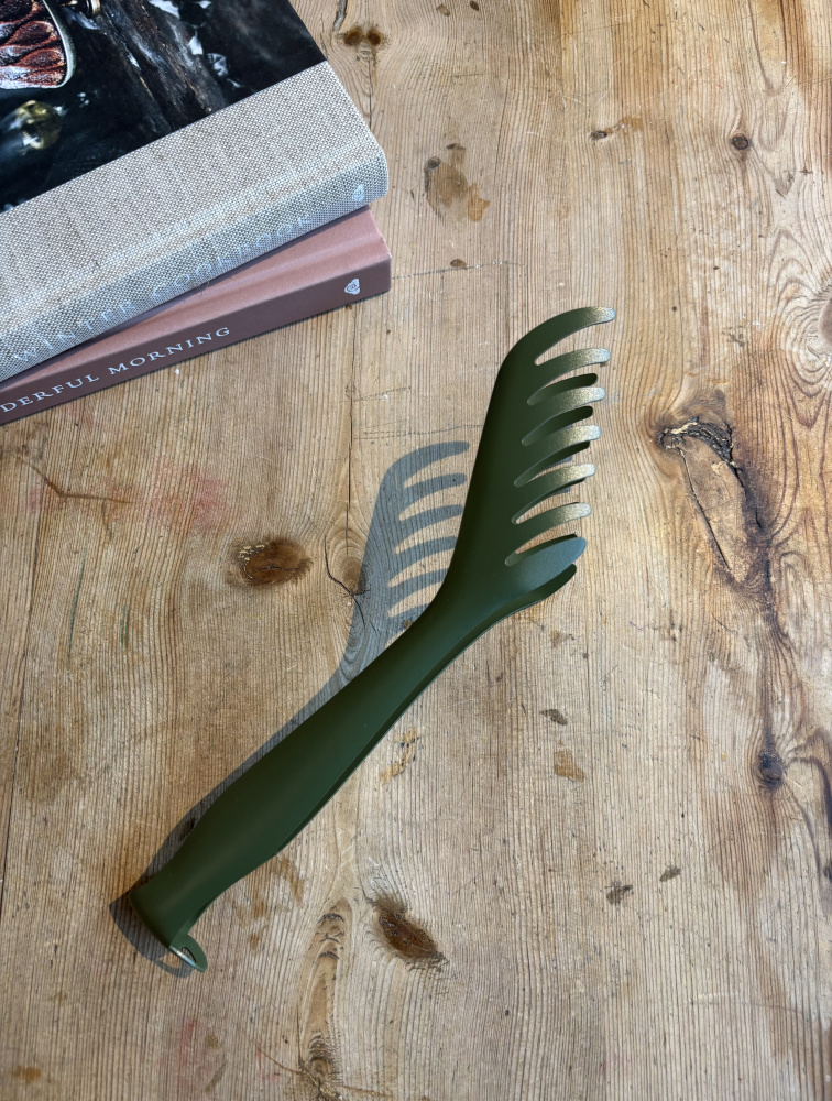 Søt pastaklype/tang av metall fra Roger Orfèvre, 24 cm. Laget av rustfritt stål som er lakkert i farge, men tåler ikke oppvaskmaskin. Produsert i Frankrike.