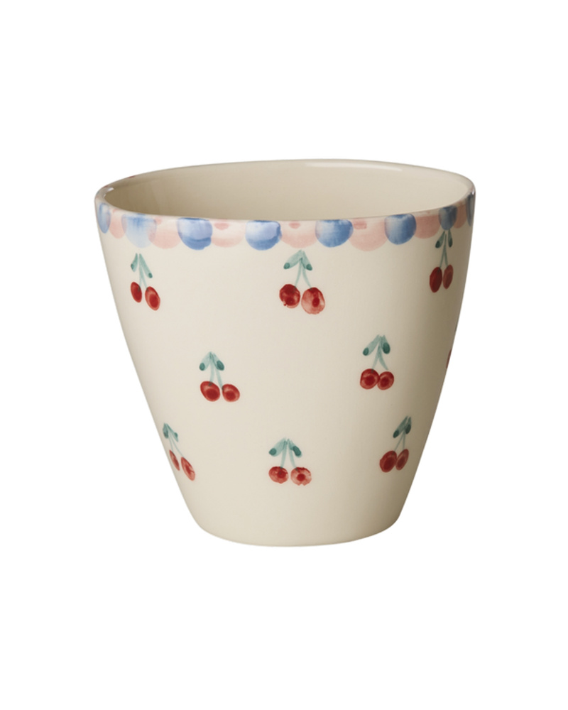 Oval kopp uten hank av håndmalt keramikk fra Rice, 10 x 9,5 x 8 cm.
