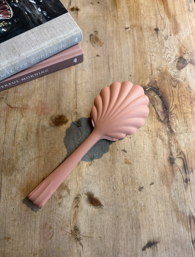 Søt salatklype/tang av metall fra Roger Orfèvre, 21 cm. Laget av rustfritt stål som er lakkert i farge, men tåler ikke oppvaskmaskin. Produsert i Frankrike.