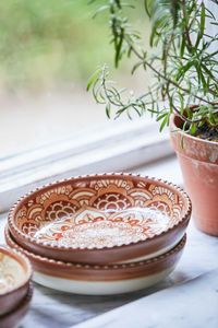 Skål i en ny serie med spansk keramikk fra Spliid, 25 cm i diameter og fin til servering. Håndmalte detaljer, kan vaskes i maskin og brukes i ovn og mikro.