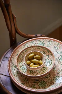 Lav skål i en ny serie med spansk keramikk fra Spliid, 18 cm i diameter, fin til både servering og som porsjonsskål. Kan selvsagt brukes til pynt eller til et telys eller til smykker også. Håndmalte detaljer, kan vaskes i maskin og brukes i ovn og mikro.