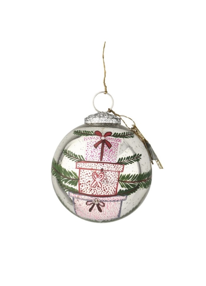 Vakker, vakker glasskule fra Walther & Co, med mønster av grankvister og julegaver, med oppheng. 7 cm i diameter.