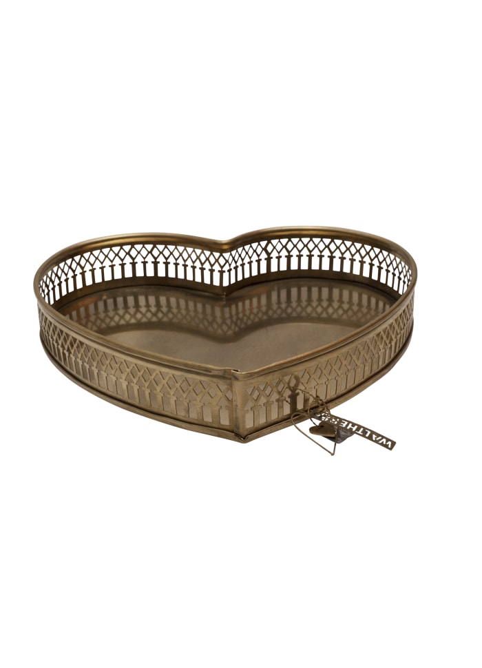Et hjerteormet brett i messing, perfekt til å samle lys på, den fineste pynten eller til å servere god drikke fra. 25 cm i diameter, håndlaget.